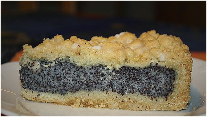 Die Mohnpuddingmasse in die Tortenform gießen und den restlichen Teig darauf „verkrümeln“