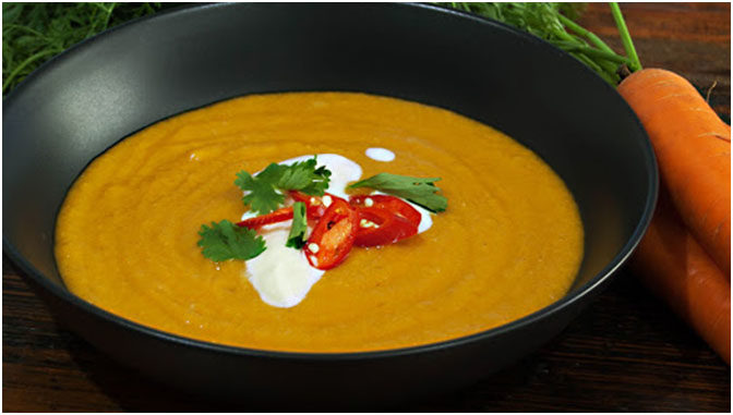 - Gemüsebrühe aufgießen, Hitze reduzieren und das Ganze 20 Minuten köcheln lassen. Suppe mit dem Stabmixer pürieren. Kokosmilch eingießen und aufkochen lassen.