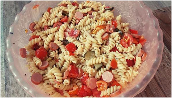 Die kleingeschnittene Wurst, gewürfelten Käse, gewürfelte Tomaten und in Scheibchen geschnittene saure Gurken und die abgekühlte Nudel – Erbsenmischung zu dem Miracel Whip geben, durchrühren und mindestens 3 Stunden kalt stellen. Am besten über Nacht, dann schmeckts am besten.