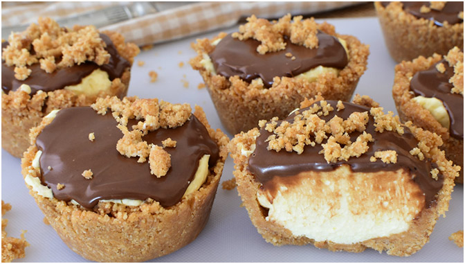 Wir legen eine Muffinform mit Frischhaltefolie aus und legen einige zerkleinerte Kekse hinein. Wir machen eine Schale, indem wir sie um die Form modellieren. 30 Minuten im Kühlschrank ruhen lassen.