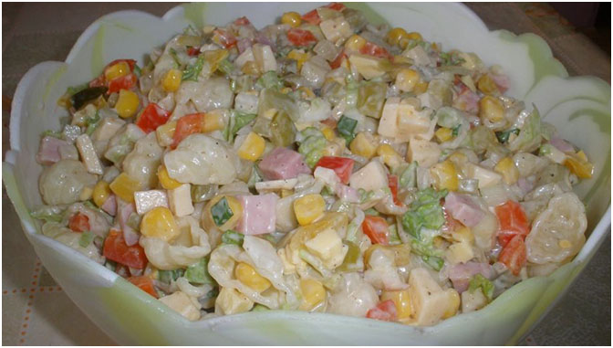 4. Die gekochten und leicht abgekühlten Nudeln zu den restlichen Zutaten geben und mit der Mayonnaise vermischen. Salzen und pfeffern.