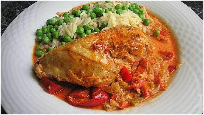 Die Hähnchenfilets waschen und mit Küchenkrepp trocken tupfen. Mit Salz und Paprikapulver würzen und in einer Auflaufform dicht aneinanderlegen. Die Paprikaschoten waschen, entkernen, in schmale Streifen schneiden und auf den Filets verteilen.Die Zwiebel in halbe Ringe schneiden und in einer Pfanne in etwas Öl andünsten. Die Chilischote hineinzupfen, den Knoblauch pressen und hinzugeben. Paprikapulver und Tomatenmark hinzufügen, mit der Brühe ablöschen und kurz aufkochen lassen. Anschließend Sahne und Schmand unter die Soße rühren und mit Salz abschmecken. Die Soße in die Auflaufform gießen, Fleisch und Paprikastreifen sollten ganz bedeckt sein. Den geriebenen Käse gleichmäßig darauf verteilen.