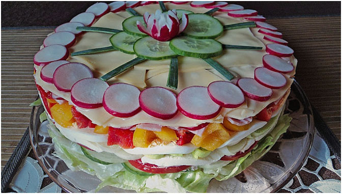 In einem Tortenring den Salat fest andrücken, alle Zutaten (bis zum Käse) fest in den Tortenring schichten. Zum Schluss den Gouda auf die Torte legen und in den Kühlschrank stellen. Vor dem Servieren den Thunfisch auf dem Käse verteilen und mit Oliven und Radieschen verzieren.