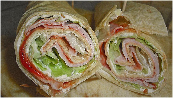 Die Wraps auslegen und dünn in der Mitte mit dem Frischkäse Sorte India bestreichen. Am Rand je 2 cm rundherum nicht mit bestreichen. Darauf die Salatmischung 4 Jahreszeiten geben. Ein wenig Remoulade auf den Salat geben. Dann jeden der Teigfladen mit 2 Scheiben Putenbrust belegen. In einer Schüssel ein wenig Ketchup mit Sambal Oelek vermischen und die Putenbrustscheiben dünn damit bestreichen. Die Tortillas vorsichtig eng aufrollen.