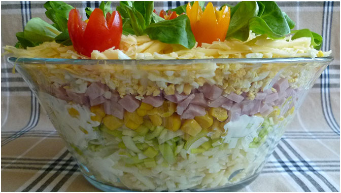2. Alle Zutaten nacheinander in eine Schüssel schichten: Sellerie, Apfel, Schinken, Lauch, Mais, Ananas und die Eischeiben. Darüber die Mayonnaise verteilen und die Schüssel auf einen weichen Untergrund leicht aufstoßen, damit möglichst wenig Zwischenraum zwischen den Zutaten bleibt. Mit dem Käse bestreuen und zugedeckt etwa 8 Std., am besten über Nacht, im Kühlschrank ziehen lassen. Zum Servieren den Salat so aus der Schüssel schöpfen, dass von allen Zutaten etwas dabei ist.