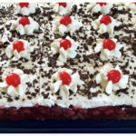 Biskuit auf eine große Platte (Tablett) stürzen, Papier abziehen. Quarkmasse auf dem Biskuit glatt verstreichen. Mit einem Messer in die Creme 24 Stücke (Quadrate 4 mal 6) vorritzen.