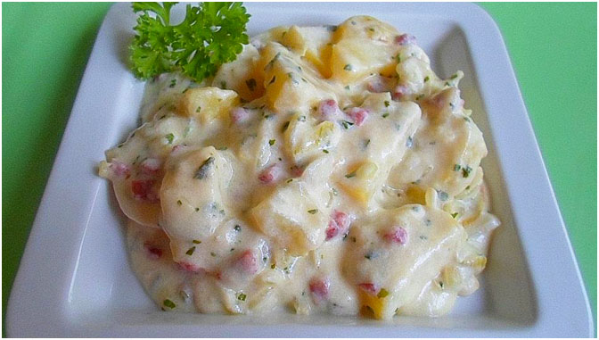 Die Kartoffeln pellen, dazugeben und in der Sauce heiß werden lassen.