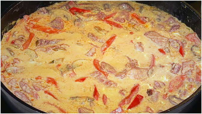 Das Kasseler leicht anbraten und dann die Zwiebel und die Pilze dazugeben. Alles mit Pfeffer und Paprikapulver würzen (Salz ist nicht nötig, da das Kassler schon salzig genug ist), danach die Paprikastreifen zufügen. Zuletzt etwa eine halbe Packung Kräuterfrischkäse zufügen. Wenn dieser verlaufen ist, alles ggf. nochmal abschmecken.