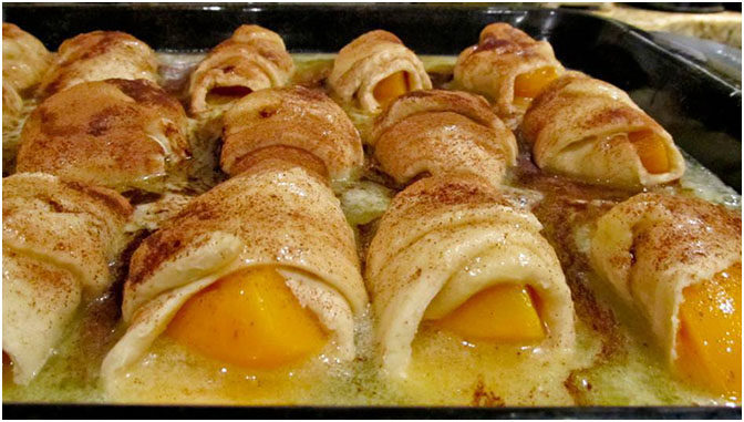 Den Backofen auf 350° vorheizen und eine 9×13 Pfanne mit Butter bestreichen. Zuerst die Pfirsiche zubereiten. Die Pfirsiche schälen, entkernen und in 8 Scheiben schneiden. Jede Pfirsichscheibe in eine Halbmondrolle rollen und in der Pfanne anordnen.in einem Topf die Butter schmelzen lassen und Zucker und Vanille unterrühren.die Buttermischung über die Pfirsiche und den Bergtau am Rand gießen.etwas Zimt darüber streuen und 40 Minuten backen.
