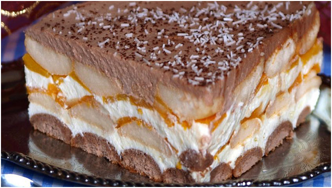 1. Für diese Torte braucht man Eierplätzchen (oder Löffelbiskuits), 5 Becher saure Sahne, 1 Dose Pfirsiche, Sahnesteif, Puderzucker, gesüßtes Kakaopulver und Schokostreusel zum Verzieren.