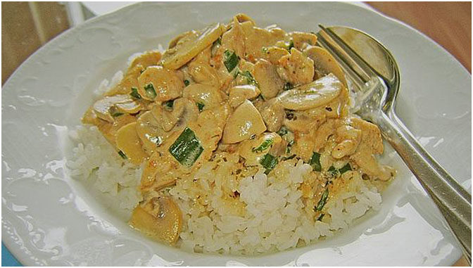 Putenschnitzel in kleine Streifen schneiden. Die Zwiebel hacken und mit dem Fleisch in etwas Öl anbraten. Fleisch aus der Pfanne nehmen und Gemüsebrühe aufkochen lassen. Darin den Philadelphiakäse schmelzen, Champignons und Fleisch dazugeben, etwas köcheln lassen, falls die Sauce zu dünn ist, etwas Saucenbinder dazu und mit frischer Petersilie bestreuen.