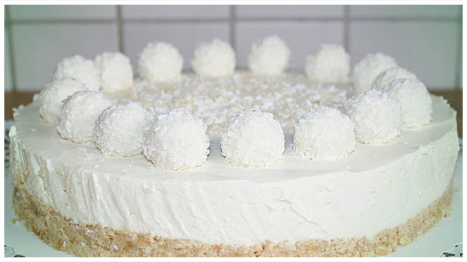 Die fertige Creme gleichmäßig auf dem Boden verteilen und für mindestens 3 Stunden, besser noch über Nacht in den Kühlschrank stellen. Vor dem Servieren mit den Raffaello-Kugeln verzieren.