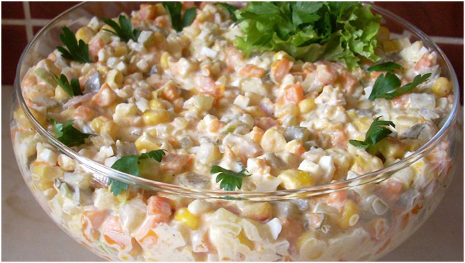 Mayonnaise mit Pfeffer und ein wenig Flüssigkeit von den Gewürzgurken abschmecken und zu den Gemüsewürfeln geben. Alles ordentlich verrühren und kühl stellen.