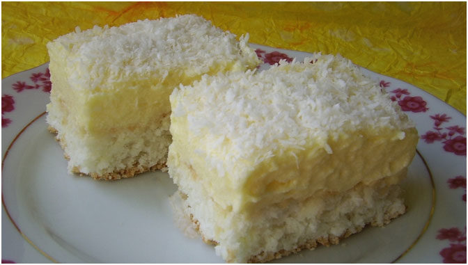 - Den Rest der Kokosraspeln in einer Pfanne ohne Fett rösten und die Oberseite des Kuchens damit bestreuen. Den Kuchen kalt stellen. Am besten schmeckt er, wenn er über Nacht geruht hat.
