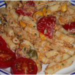 Nudeln mit der Sauce mischen, in eine große Auflaufform geben, mit Käse bestreuen und bei 180 °C Umluft überbacken, bis der Käse schön zerlaufen ist.