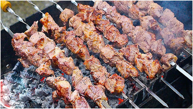 Das Fleisch aus der Marinade nehmen und auf Schaschlik-Spieße stecken. Mit Salz und Pfeffer würzen und auf dem heißen Grill rundherum 10-15 Minuten garen.