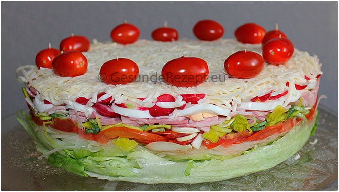 - Boden und Rand einer Springform (24 cm Ø) vorsichtig mit den Salatblättern auslegen, so dass die Form vollständig ausgekleidet ist. Boden der Salattorte dünn mit dem Dressing einstreichen. Mit der Hälfte der Käsescheiben belegen. Putenaufschnitt gleichmäßig darauf verteilen. Eier, Rest Salat und Tomaten einschichten, mit Käse abschließen und restliches Dressing dünn daraufstreichen. Ca. 45 Minuten im Kühlschrank durchziehen lassen.