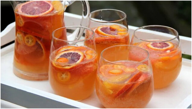 - Nun das geschnittene Obst in eine große Schüssel oder Karaffe geben, Orangenlikör, Orangensaft, Rotwein und Zucker hinzufügen und alle Zutaten gut verrühren.