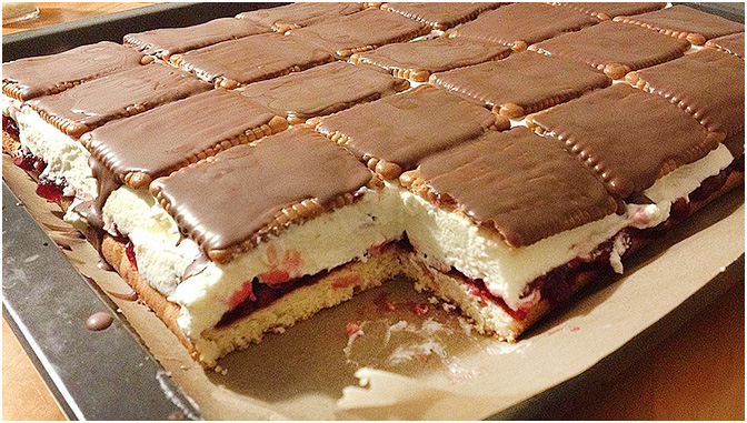 Die Preiselbeeren auf der Oberfläche des Biskuitkuchens gleichmäßig verteilen. Die Sahne mit Sahnesteif steif schlagen und damit den Kuchen bestreichen. Die Butterkekse einzeln kurz in den Rum tauchen, anschließend gleichmäßig, dicht und vollständig die Sahne damit abdecken.