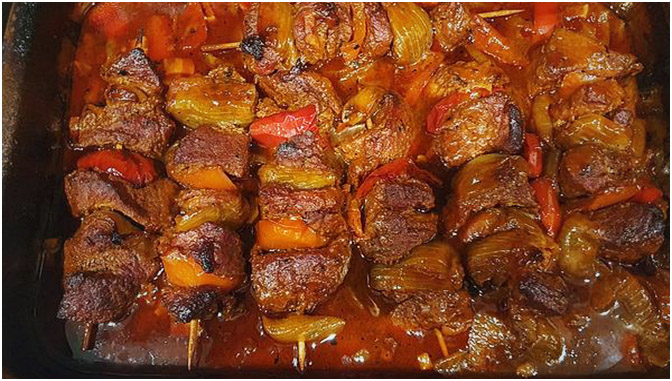 Die übriggebliebenen Zwiebeln, Paprika und den kleingeschnittenen Bauchspeck in die Form geben und anbraten. Nun die Paprikapaste und das Tomatenmark zugeben, verrühren und kurz aufkochen lassen. Mit der Rinderbrühe ablöschen und die Spieße wieder in die Form legen.