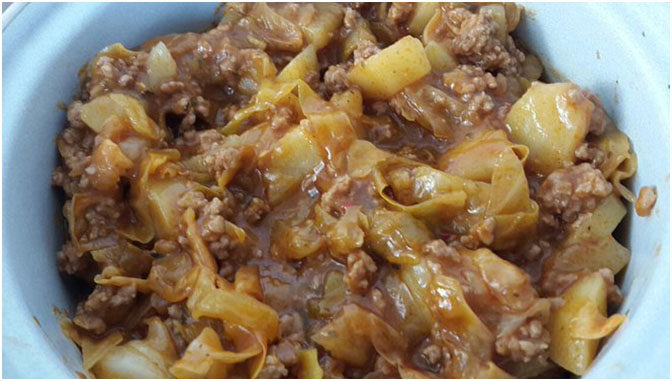 In einer Pfanne das Hackfleisch kräftig anbraten, mit Pfeffer und Salz würzen. Dann zum Kohl geben. Mit ca. 1-1,5 Liter Wasser ablöschen und etwas Instantbrühe oder Brühwürfel hinzugeben und abschmecken. das ganze ab. Nach Geschmack Kümmel hinzugeben. Wer Kümmelsaat nicht mag, kann auch gemahlenen Kümmel verwenden.