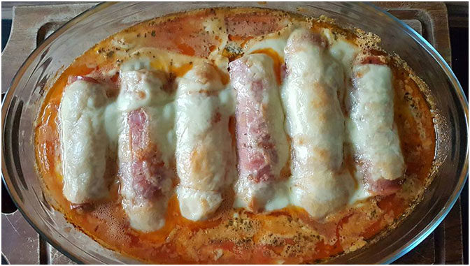 Das Hackfleisch mit dem Ei, dem Paniermehl, den Kräutern, Pfeffer, Salz und 1/2 gewürfelten Zwiebel vermischen. Einzelne Portionen in je eine Scheibe Schinken einrollen und in eine Auflaufform legen.Nun die restlichen Zwiebelwürfel in einer Pfanne glasig anschwitzen, den Knoblauch dazugeben und kurz mitbraten. Tomatenmark zugeben und ebenfalls kurz mitbraten, dann das Mehl dazu und mit Wasser und den pürierten Tomaten ablöschen. Mit Basilikum, Zucker, Pfeffer und Salz abschmecken und zum Schluss den gewürfelten Mozzarella unterrühren.