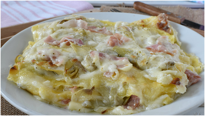 Die Auflaufform gründlich mit Butter oder Öl einfetten und mit Lasagne auslegen. Diese mit der Bechamelsauce bestreichen, darauf Schinkenscheiben legen und mit geriebenem Gouda bestreuen. Diesen Schritt so lange wiederholen, bis alle Zutaten verbraucht sind. Zum Schluss nur noch mit geriebenem Parmesan (50 g) bestreuen und in den Backofen schieben.
