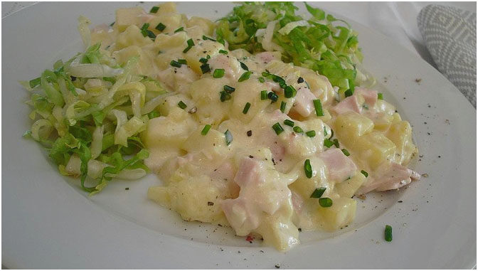 Schmand mit Milch erhitzen, mit Salz, Pfeffer und Muskatnuss würzen. Kartoffeln und Schinken dazugeben und kurz erwärmen. Mit Schnittlauch bestreuen.