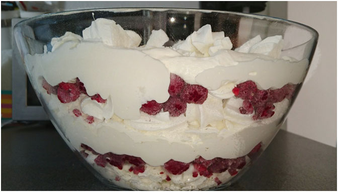 Baiser in eine Schüssel füllen und zerstoßen. Beeren darüber und dann die geschlagenen Sahne. Ca. 6 Stunden in den Kühlschrank stellen.