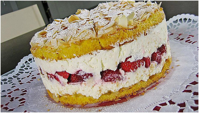 Die Torte kann ebenso mit Himbeeren als Himbeertorte zubereitet werden.