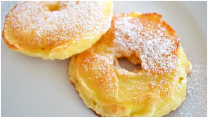 In einer Pfanne das Fett heiß werden lassen. Die Apfelringe in den Teig tauchen und im heißen Fett ausbacken. Öfter wenden, sobald sie schön goldbraun sind aus der Pfanne nehmen und auf Küchenpapier abtropfen lassen.