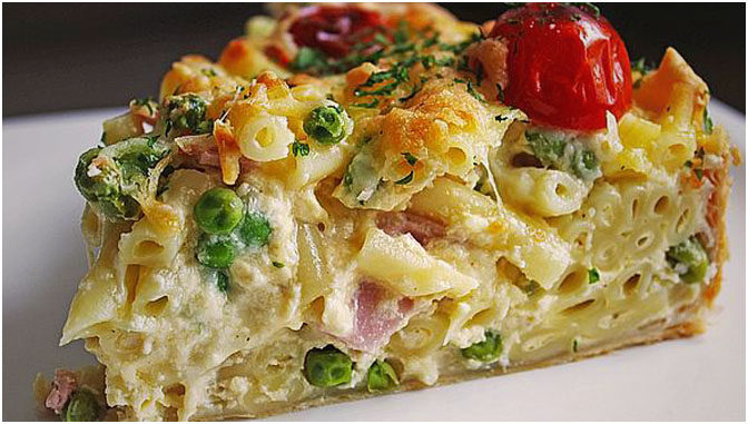 Eine Springform fetten, den Blätterteig hineinlegen und einen etwa 5 cm hohen Rand formen. Mit einer Gabel Löcher in den Boden stechen. Nun kommen die Makkaroni, der Schinken, die Erbsen und der Käse in die Springform auf den Teig.