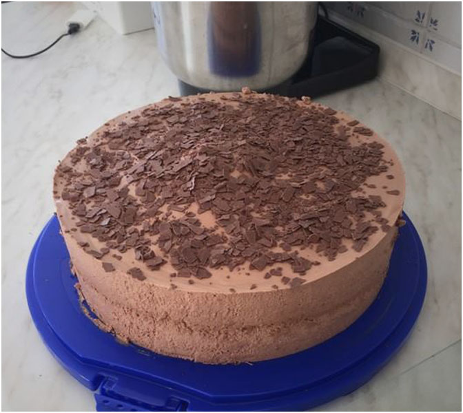Die Eier mit Zucker schlagen. Öl und Milch dazugeben. Kakao, Mehl und Backpulver untermischen. Den Teig in die Form (28 cm Durchmesser) füllen und im Ofen ca. 40 – 45 Min. backen. Stäbdchentest machen.