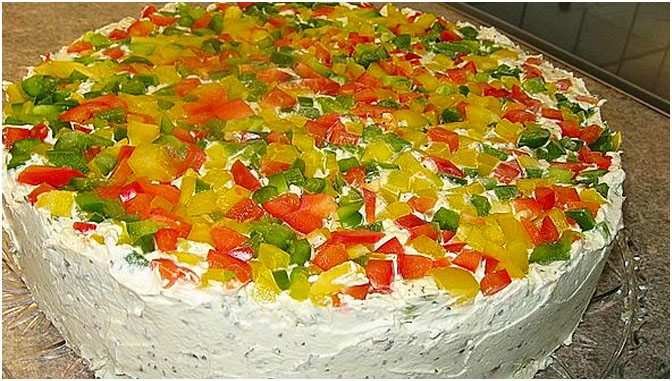 Zwiebel in sehr kleine Würfel schneiden, mit dem Dill und dem restlichen Frischkäse vermengen, mit Salz und Pfeffer würzen und auf der dritten Schwarzbrotschicht verteilen. Die restlichen Paprikawürfel oben auf der Torte verteilen.