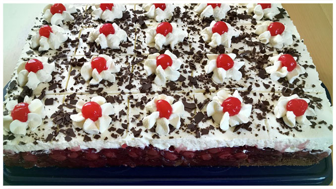 Die Sauerkirschen mit Saft und 2 Pck. Vanillepuddingpulver (dieses erst mit etwas Kirschsaft anrühren) zusammen aufkochen und auf den noch heißen Teig verteilen. Kuchen mindestens 1 Stunde abkühlen lassen.