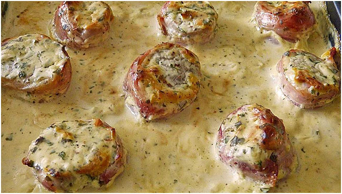 Schweinefilet in Bacon mit Frischkäsesoße überbacken