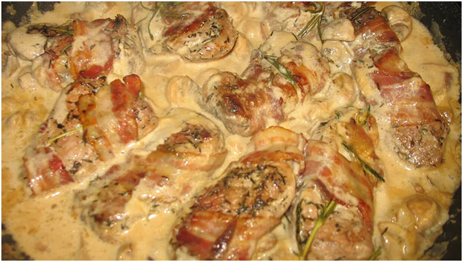 2 Schweinefilets waschen und trocken tupfen. In ca. 2-3 cm dicke Medaillons schneiden, mit Salz und Pfeffer würzen. Jedes Medaillon dünn mit Senf bestreichen. Medaillons jeweils mit einer Scheibe Bacon umwickeln und mit der “Nahtstelle” nach unten auf ein Backblech legen.