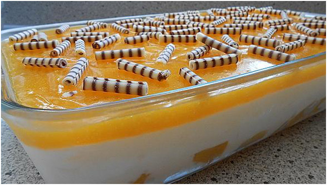 Den Maracujasaft mit dem Vanillesoßenpulver anrühren und deckend auf der Sahne verteilen. Ca. 12 Std. im Kühlschrank ziehen lassen.