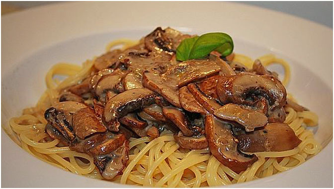 In der Zwischenzeit das Öl in einem Topf gut erhitzen und die Champignons darin scharf anbraten. Das Ganze dann mit dem Wasser ablöschen und Gemüsebrühe (nach Anleitung dosieren) mit dazu geben. 2 Min. köcheln lassen.