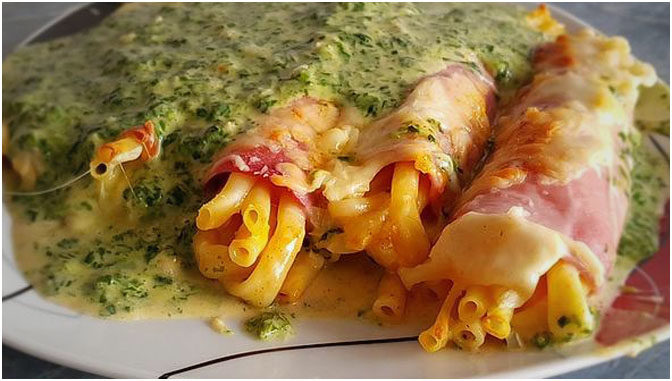 Jede Schinkenscheibe mit jeweils einer Käsescheibe belegen. Eine Handvoll Makkaroni drauflegen und aufrollen. Die Rollen auf den Spinat legen.