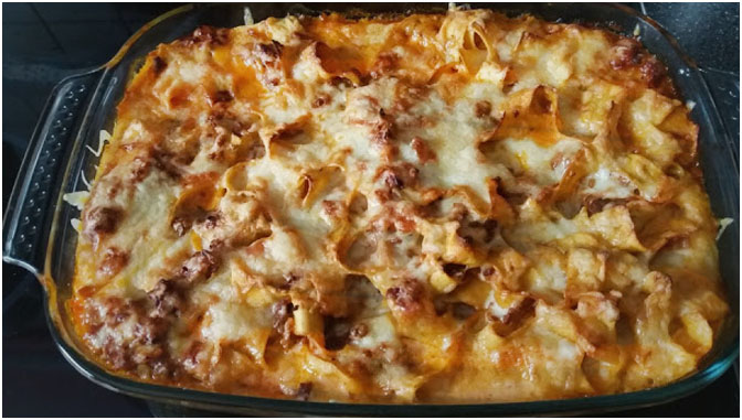 Gleichzeitig die in Würfel gehackte Zwiebel in Öl anbraten, dann das Hackfleisch dazugeben und ebenfalls anbraten. Mit dem Rotwein ablöschen und mit Tomatenmark, Thymian, Cayennepfeffer und Salz abschmecken. Dann die Nudeln unterheben. Das Ganze in eine gefettete Auflaufform geben. Käse und Sahne darüber verteilen. Im vorgeheizten Backofen bei 200 °C Umluft ca. 25 – 30 Minuten überbacken. Heiß servieren.
