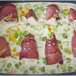 Gleichzeitig die in Würfel gehackte Zwiebel in Öl anbraten, dann das Hackfleisch dazugeben und ebenfalls anbraten. Mit dem Rotwein ablöschen und mit Tomatenmark, Thymian, Cayennepfeffer und Salz abschmecken. Dann die Nudeln unterheben. Das Ganze in eine gefettete Auflaufform geben. Käse und Sahne darüber verteilen. Im vorgeheizten Backofen bei 200 °C Umluft ca. 25 – 30 Minuten überbacken. Heiß servieren.