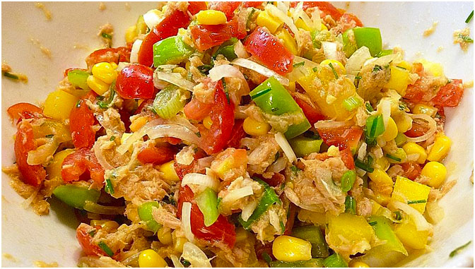 Zwiebeln, Knoblauch, Tomaten, Paprika, Schnittlauch, Thunfisch und Mais in einer Salatschüssel vermengen.