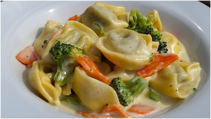 Das Olivenöl in einer Pfanne (am besten geht das im Wok) erhitzen und das Mehl darin anschwitzen. Dann mit Gemüsebrühe, Sahne(ersatz) und Milch ablöschen. Den Schmelzkäse in der Soße schmelzen und die Soße aufkochen lassen. Nun das Gemüse hinzugeben und in der Soße 10 min. köcheln lassen. Mit Muskat und evtl. noch etwas Salz abschmecken. Die Tortelloni in die Soße geben, alles gut vermengen.