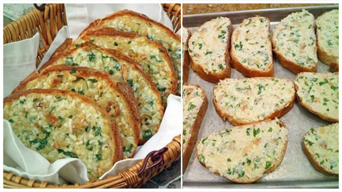 - Das Brot in Scheiben schneiden und jede Scheibe mit dem vorbereiteten Knoblauchaufstrich bestreichen. Die Brotscheiben auf ein mit Öl gefettetes Backblech legen und bei 240 °C ca. 3-4 Minuten backen (auf Grillfunktion).