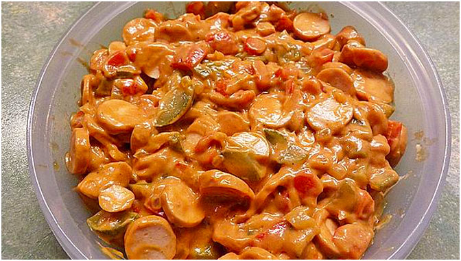 Die Würstchen und die Gewürzgurken in Scheiben schneiden. Die Paprikaschote und die Zwiebel würfeln und in etwas Öl anschwitzen.