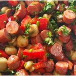 Die Würstchen und die Gewürzgurken in Scheiben schneiden. Die Paprikaschote und die Zwiebel würfeln und in etwas Öl anschwitzen.