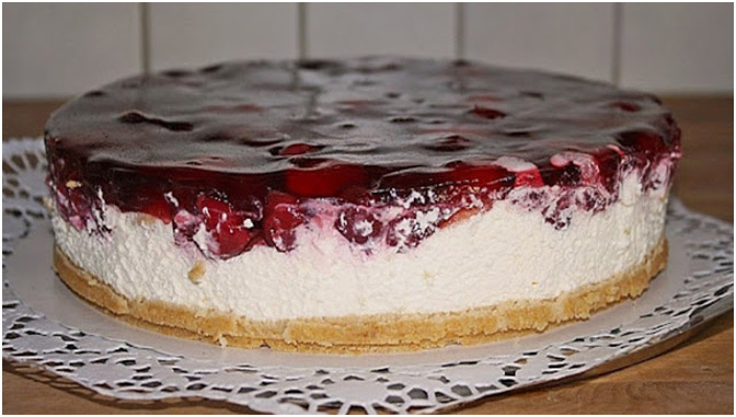 Die Löffelbiskuits zerbröseln und die Margarine schmelzen. Mischen und auf einem Springformboden fest andrücken. Die Sahne schlagen und mit dem Frischkäse verrühren, auf den Boden streichen. Die Windbeutel darauf legen. In den Lücken die Sauerkirschen verteilen. Mit Tortenguss überziehen.