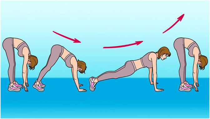 Bewegen Sie sich mit den Händen vorwärts, als würden Sie mit ihnen gehen, da Sie sie zur Unterstützung des Körpers einsetzen. Sie müssen den Rumpf fest halten und die Muskeln anspannen.