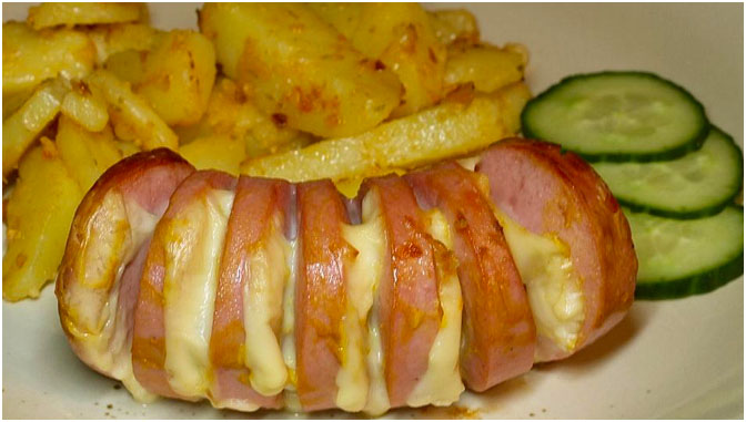 Die Fleischwurst in Abständen von 1 cm tief einschneiden, den Ring auf ein vorbereitetes Backblech setzen. Den Käse in so viele Scheiben schneiden wie Schnitte in der Wurst sind. Die Wurst mit dem Senf bestreichen und die Käsescheiben in die Einschnitte legen. Wurst und Käse mit Öl überpinseln und im heißen Backofen etwa 20 min. garen.